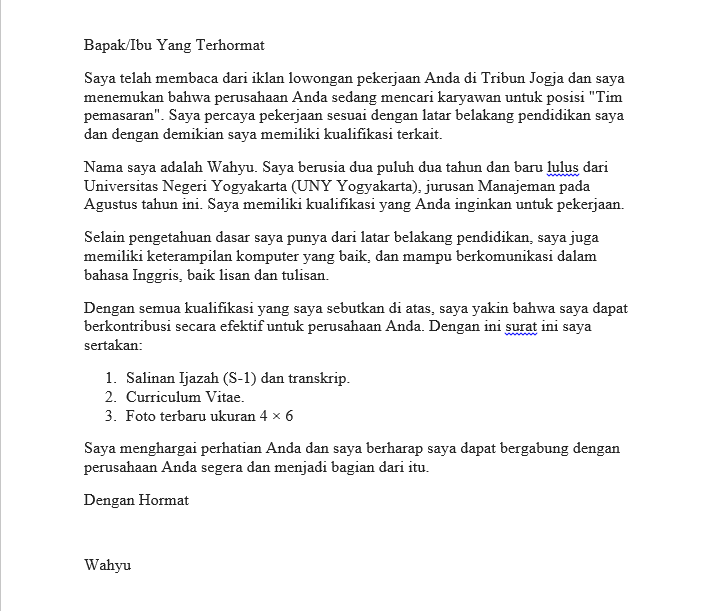 Nama saya adalah Wahyu. Saya berusia dua puluh dua tahun dan baru lulus dari Universitas Negeri Yogyakarta (UNY Yogyakarta), jurusan Manajeman pada Agustus tahun ini. Saya memiliki kualifikasi yang Anda inginkan untuk pekerjaan.