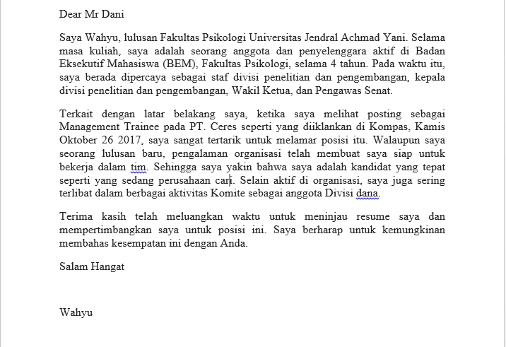 Terkait dengan latar belakang saya, ketika saya melihat posting sebagai Management Trainee pada PT. Ceres seperti yang diiklankan di Kompas, Kamis Oktober 26 2017, saya sangat tertarik untuk melamar posisi itu. Walaupun saya seorang Iulusan baru, pengalaman organisasi telah membuat saya siap untuk bekerja dalam tim. Sehingga saya yakin bahwa saya adalah kandidat yang tepat seperti yang sedang perusahaan car}. Selain aktif di organisasi, saya juga sering terlibat dalam berbagai aktivitas Komite sebagai anggota Divisi dana.