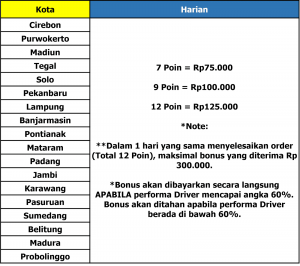 - Misalnya, driver Go Car pada hari Senin – Jumat, bisa memperoleh 6 poin, maka bonus yang dia terima sebanyak Rp 80.000,-